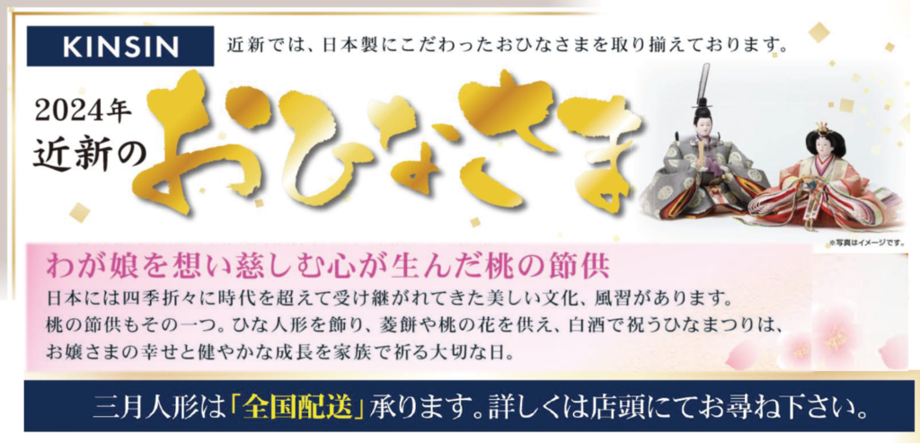 わが娘を想い慈しむ心が生んだ桃の節句。三月人形「おひなさま」フェアを全店で開催中。期間中はお飾りやお手入れセットなどの「まごころセット」をプレゼント。是非、この機会のご来店をお待ち申し上げます。