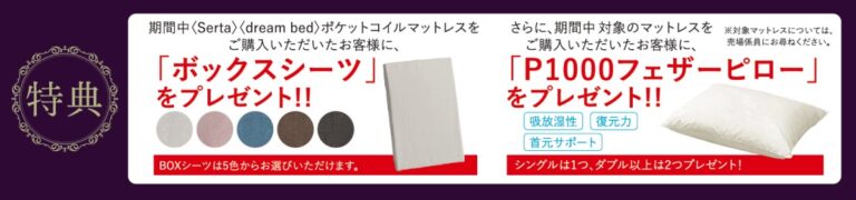 近江大橋店にて、2023年2月23日(水)から3月28日(火)まで「サータベッド特別キャンペーン」を開催致します。期間中は期間限定の特別商品をご用意、また対象商品をお買い上げのお客様には「BOXシーツ」、「フェザーピロー」をプレゼント致します。是非、この機会のご来店をお待ち申し上げます。