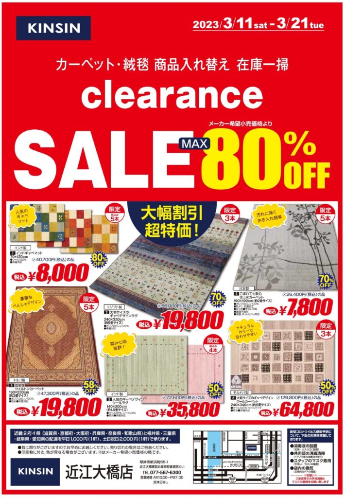 近江大橋店にて、「カーペット・絨毯クリアランスセール」を2023年3月11日(土)から21日(火)まで開催致します。春夏物カーペット・絨毯の導入に向けて、秋冬物から数量限定の掘り出し物を山積み大奉仕致します。数に限りがございますのでお早めにお越し下さい。