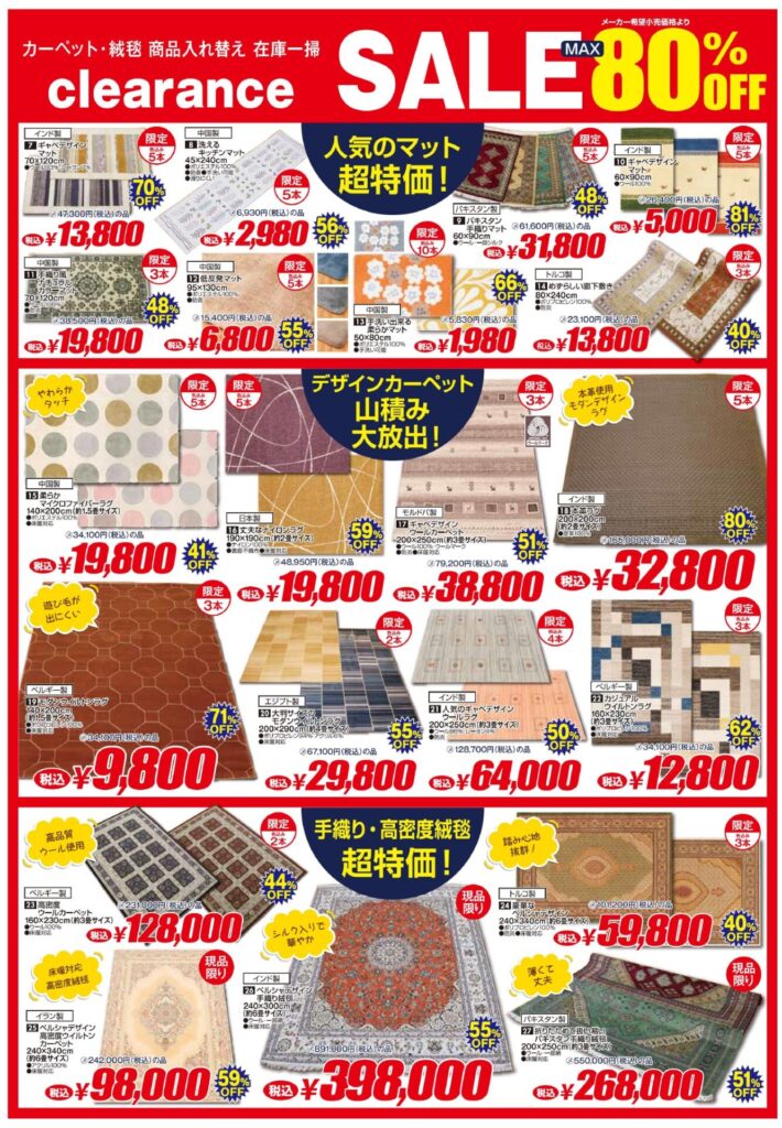 手織り・高密度絨毯も超特価!