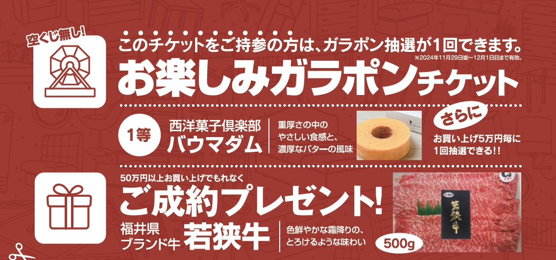 福井県産業会館で第2回 「家具の祭典」を2024年11月29日(金)から12月1日(日)の3日間限定の特別価格で開催いたします。皆様のご来場をお待ち申し上げます。