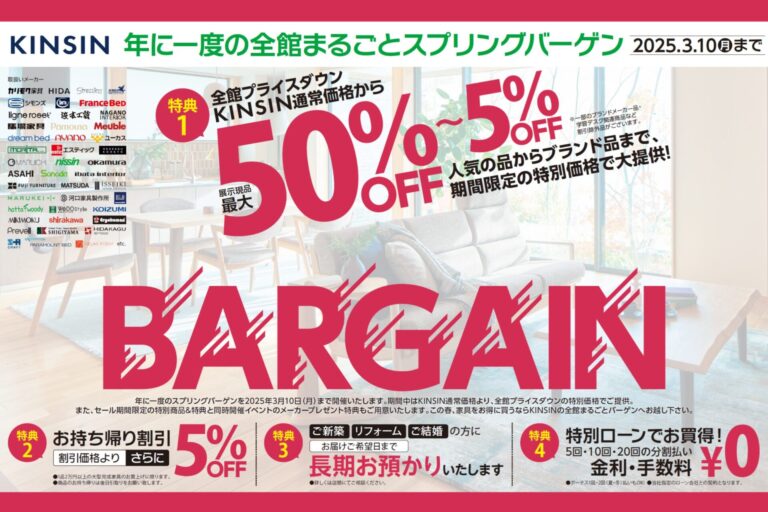 半期に一度のビッグチャンス!全館プライスダウン!全館まるごとバーゲン!セール限定のスペシャル商品と、期間限定の特典が満載。この春、家具・インテリア用品をお得に買うなら、KINSIN全館まるごとバーゲンへご来店ください。