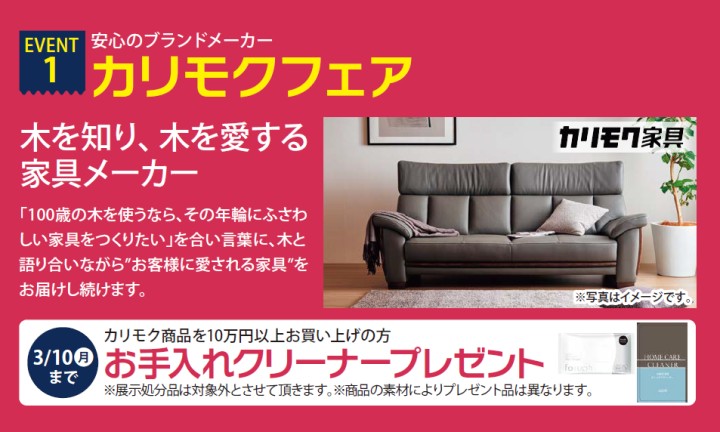 ※1品2万円以上の大型完成家具のお買上げに限ります。※商品のお持ち帰りは後日引取りをお願い致します。