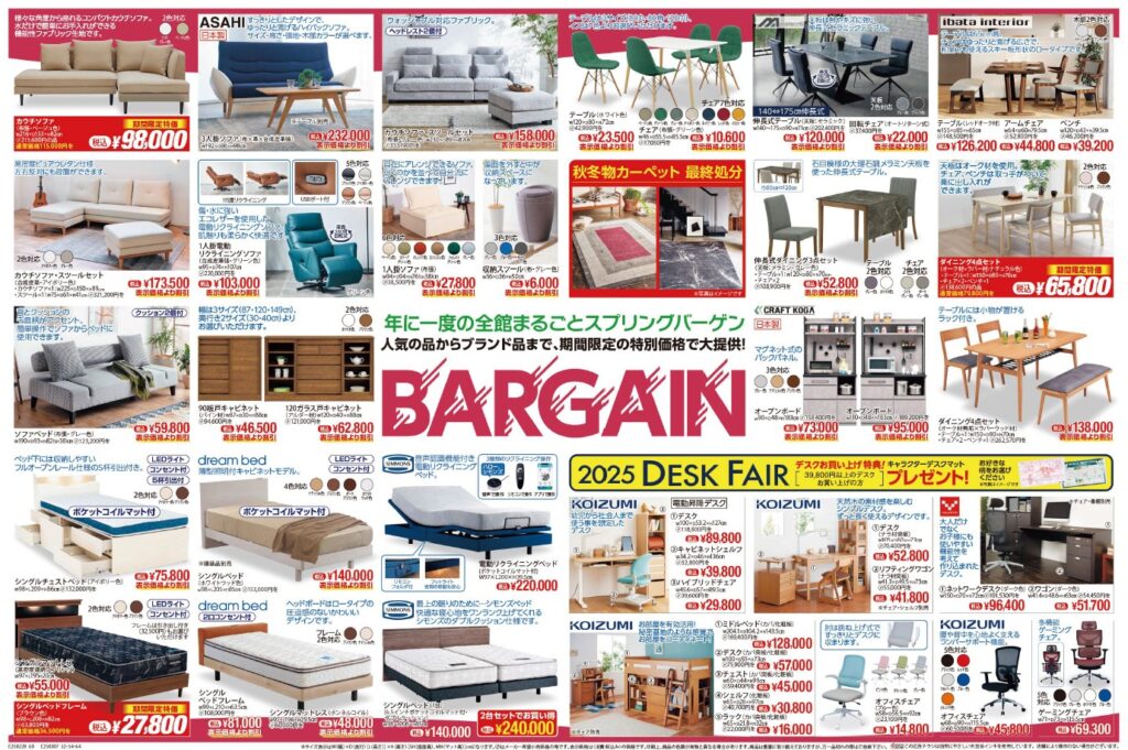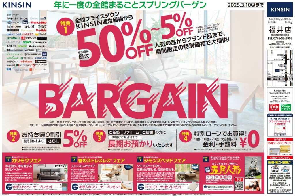 半期に一度のビッグチャンス!全館プライスダウン!全館まるごとバーゲン!セール限定のスペシャル商品と、期間限定の特典が満載。この春、家具・インテリア用品をお得に買うなら、KINSIN全館まるごとバーゲンへご来店ください。