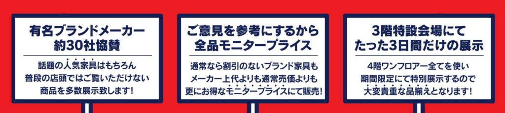 通常なら割引のないブランド家具も通常価格より更にお得なモニタープライスにて販売!