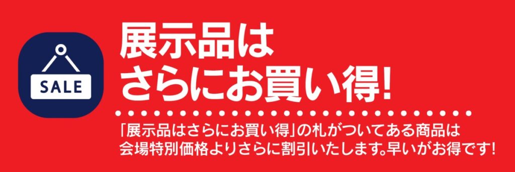「展示品はさらにお買い得」の札がついてある商品は会場特別価格よりさらに割引いたします。お早目にご来店ください!