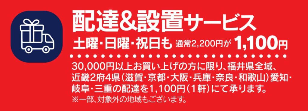 30,000円以上お買上げの方に限り、福井県・近畿2府4県・愛知県・岐阜県・三重県の配達を1,100円(1軒)で承ります。