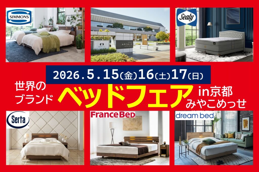 京都市勧業館みやこめっせ1F第2展示場Aホールにて、「第3回世界のベッドフェア」を2026年5月15日(金)・16日(土)・17日(日)の3日間限定の特別価格で開催いたします。期間中はブランドベッドメーカー「シーリー・シモンズ・サータ・ドリームベッド・ルフ・フランスベッド」の特別限定品とフェア限定の特典が満載。この機会のご来場をお待ち申し上げます。