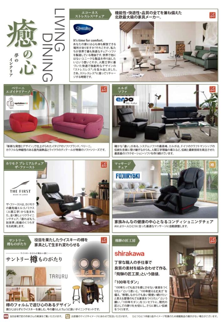 北欧最大級メーカー製品ストレスレス®チェアやイタリアの上質なソファなどをご用意いたします。