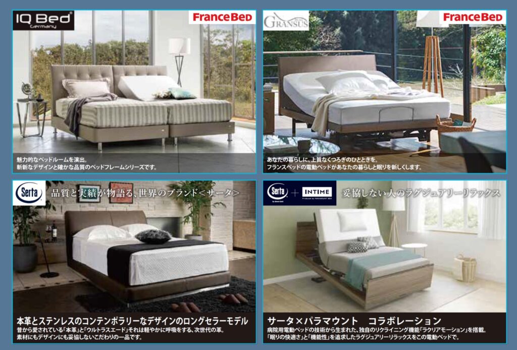 上質な寝心地のサータ・フランスベッドのベッドと電動リクライニングベッドを出展いたします。また質の高い眠りのために羽毛布団、ムートンシーツもご体感いただけます。