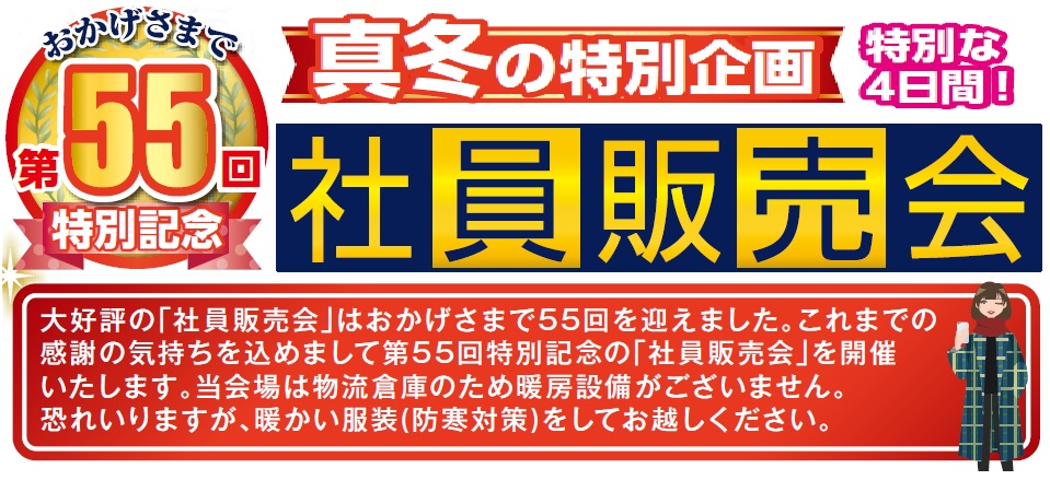 近江八幡「KINSIN 本社 物流倉庫にて」で第55回特別記念「社員販売会」を2023年1月20日(金)から23日(月)の4日間限定の特別価格で開催いたします。皆様のご来場をお待ち申し上げます。